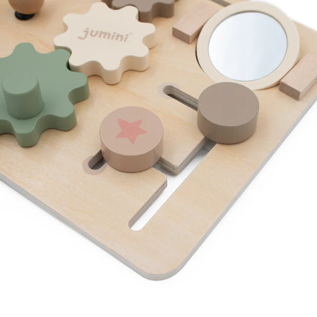 Encourage hands-on discovery with the Jumini Busy Board - packed with interactive features to support fine motor skills and early learning. Includes gears, beads and sliders to captivate curious toddlers. Beautifully designed in our soft pastel colour palette and clean, modern styling. Presented in a gorgeous gift box.