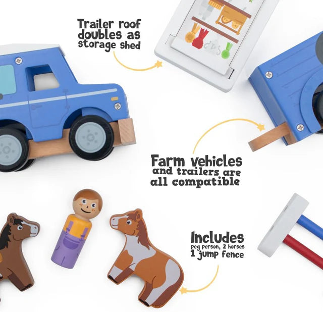 Part of the fabulous Jumini Farm Collection, the jeep and horse trailer includes a peg person together with their two ponies and a jump fence. The roof of the trailer is removable and doubles as a tack room/trophy shelf for added play value.