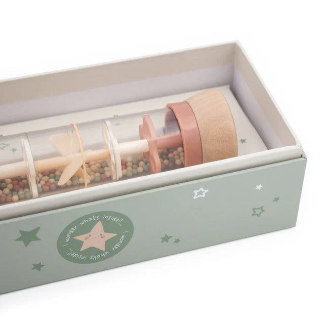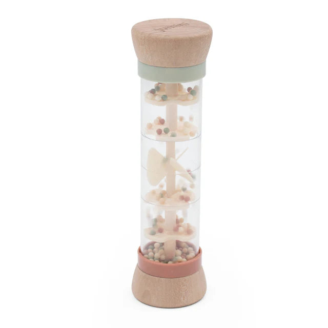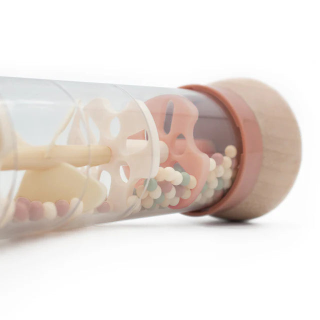 Turn the rain maker over and watch the colourful beads fall with a soothing sound. A sensory favourite for babies and toddlers alike. Beautifully designed in our soft pastel colour palette and clean, modern styling. Presented in a gift box.