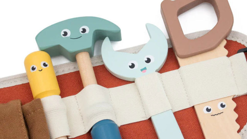 A redesign of our popular tool belt, now in a fresh new colour palette. Encourages pretend play for little ones watching DIYers at home! Each tool features a fun facial expression for added play value. Makes the perfect gift for busy little people.
