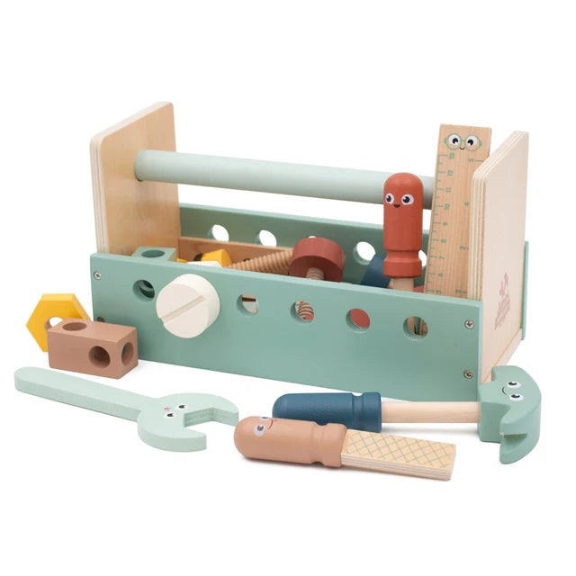 A fresh redesign of our popular tool box - this fabulous wooden toy doubles up as a mini work bench when turned upside down, and comes with 5 friendly tools and 15 construction pieces.  An ideal toy to keep them busy around the house - great for developing fine motor skills as well as creative and imaginative play.